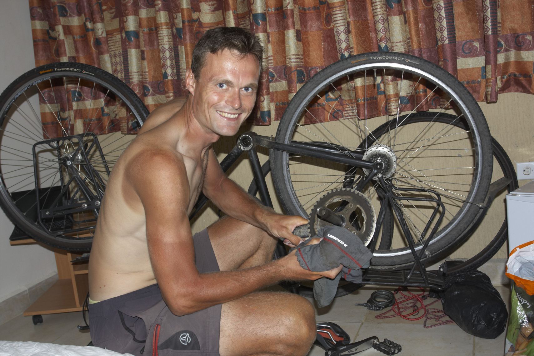 3) Těsně před džunglí jsem v 19 000 km vyměnil zadní plášť za nový, abych minimalizoval náklad. A to byla chyba, protože jsem ho na té cestě necestě téměř zničil. Poničilo se obšití (nevím jak se to správně jmenuje) obvodového drátu. A to tak hodně, že plášť začal házet. „Opravil“ jsem to alespoň nahrubo TESA páskou (když pomohla na Apolu 13, tak mě přece taky). Pomohlo to hodně, ale pořád to šlo cítit, když jsem se na to soustředil. Protože jsem se bál, aby mi ty vibrace nějak nedorasovaly Rohloffa, tak jsem nakonec tento plášť přehodil dopředu, kde je mnohem méně zatížený. Já už za jízdy nic necítím a cena přední náby je v porovnání s Rohloffem zanedbatelná a navíc je i v jižní Americe bez problému nahraditelná. Ale takto ujedu max. cca 6000 km, než sjedu zadek, takže na konec cesty budu muset nejspíš koupit nový plášť. Ach jo.