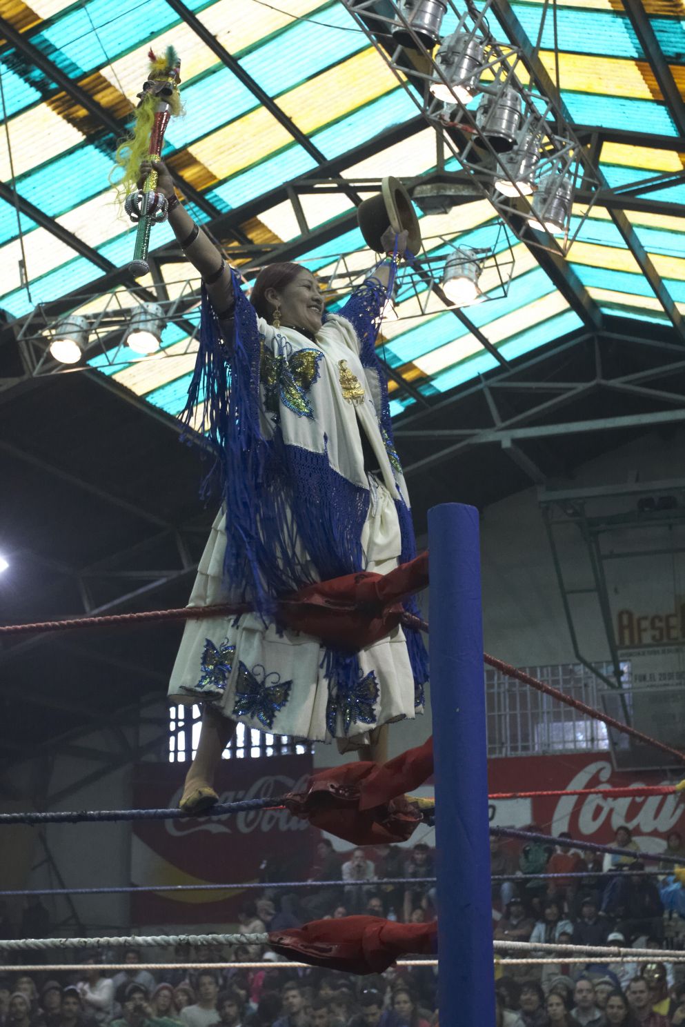 Po muzeálním dopoledni jsem si na večer vybral něco na odlehčení. Cholitas wrestling. Cholas jsou ženy v La Paz, které stále chodí v tradičním oblečení. Pokud bych je měl rychle popsat, tak asi jako takové malé silné paní s nařasenou sukní až na zem, černé husté vlasy svázané do dvou copu šahající až po sukni. A na hlavě buřinku (ženy Aymará) nebo jiný čepec. A jsou strašně milé.