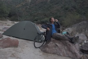 Mám bagetky s klobáskou. Mńam. Až pak začínám žvýkat. K lístkou koky se přidává ještě drobek bicarbonát sody (kdyžtak mě nějaký chemik opravte, protože to překládám z bicarbonate sodium), který uvolňuje spolu s enzymi v puse ty ňam ňam látky z lístků. V Bolívii se místo bica používá popel. Na obchodech po severozápadní Argentině vždy visí cedule s „prodáváme cocu a bicu“. A tak sedím na šutru, koukám na řeku a žvýkám asi hodinku a nic. Jen mne brní jazyk a pusa a jsou lehce necitlivé. Asi jako když se jde od zubaře. Pak mě napadlo, že bych se mohl fotit a s tím jsem se fakt zabavil. Najednou koukám, kolem je tma, já pořád na šutru, žvýkám a koukám do kamery. Hmm. Uteklo to. Každopádně závěr je, že hlad nemám (protože jsem se najedl), nemoc z výšky taky nemám (protože jsem jen v 1200 mnm) a unavený jsem pořád dost (spal jsem jen 4 hodinky a najel 110 km). Asi je v tom žvýkání nějaký skrytý fígl, který mi neřekli..