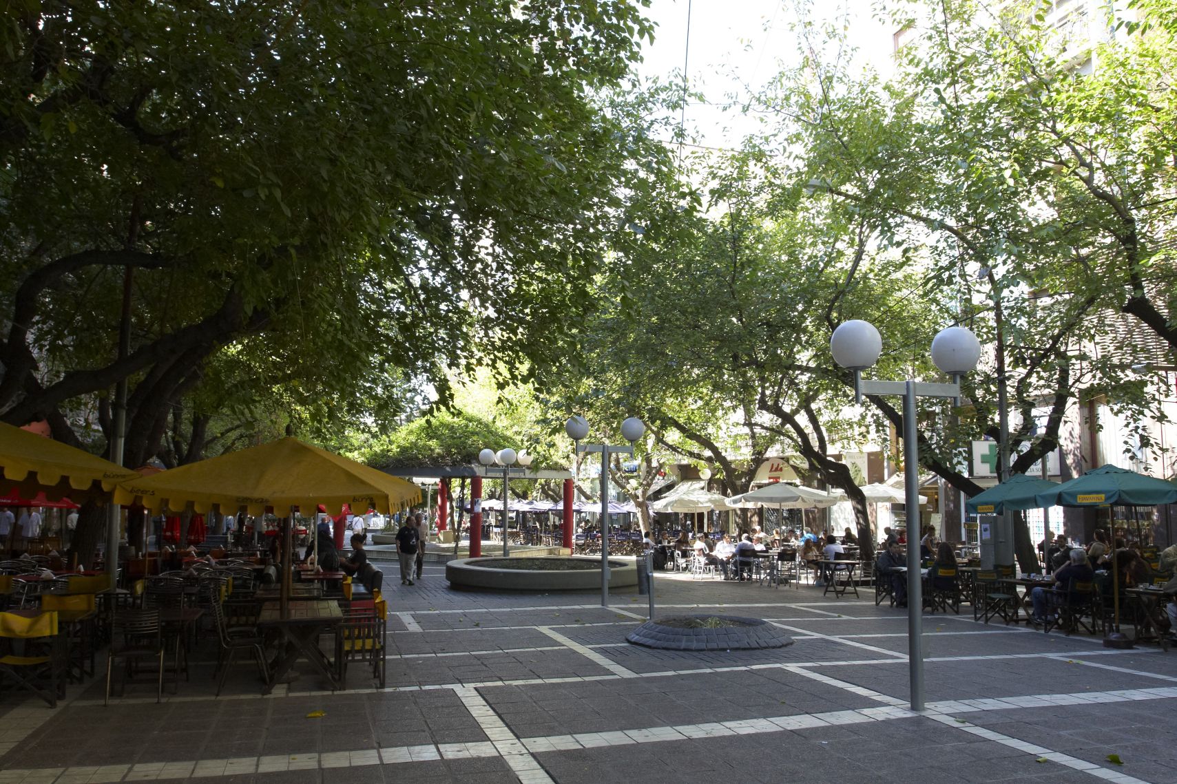 A to je i hlavní rys Mendozy. Zeleň. Ve všech ulicích jsou vzrostlé stromy, v jejichž stínu jsou stolky venkovních restaurací. V centru Mendozy je 5 hlavních parků pravidelně rozmístěných jako na hrací kostce. Ve všech jsou velké fontány a zase spousta zeleně. Jako by jsem ani nebyl v poušti. Je příjemné tu jen tak posedět, pozorovat lidi a baštit zmrzlinu