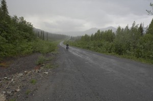 Po pár kilometrech hodině končí asfalt a začíná hliněnokamínkovatá cesta. Horší terén nám zpomaluje postup. Navečer potkáváme párek němců. Věkem někde tak po skončení vysoké. Vyrazili prvního června z Anchorage a mají v plánu dojet až do Argentiny. Takže stejný cíl jako Jirka, jen na to mají 1,5 až dva roky čas. Večer se přehnal strašný liják, který trval přes půl hodiny.