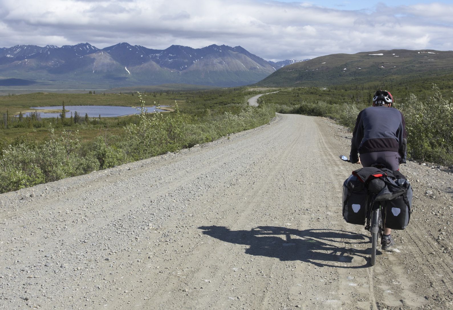 Ráno nelije. Je moc hezky a tak proti našim obvyklým jedenácti dvanácti hodinám vyjíždíme už před desátou. Terén mi přijde lepší než včera a tak si užívám přírodu kolem. Je krásně, Jirka jede jen v tričku a kraťasech. Cestou svačíme u jezera, kde je bobří přehrada. A hele, v jezeře plave i bobr. A druhý. Plavou tři čtyři metry před námi, semtam plácou ocasem do vody, načež se potopí. Je to super podívaná. A tak filmujeme a fotíme. Navečer vjíždíme do údolí, kde se objevují černé mraky. Ale objevuje se taky hospoda, takže nic není ztraceno! Po vyšlapání obrovského kopce (pro mě obrovského) jdeme s výhledem na celé široké aljašské údolí spát.