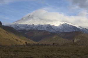 To, že mám hlouběji v tašce ještě sýry na večeři už ale nepřiznávám. 2 km za hranicí spím sám v zavřeném kempu. Pustil mě tam ranger, kterého jsem se ptal na možnost stanování. A zadarmo. Ráno vylézám ze stanu a už podruhé za dva dny zařvu „no ty krááááso“. Včera to bylo, když jsem vylezl z hospedaje a za městem Pucon jsem uviděl obrovskou kouřící sopku Villarrica (při příjezdu byla v mracích a nešla vidět). Dneska je přímo nademnou obrovitánská sopka Lanin, která byla stejně jako Villarica při příjezdu schovaná v mracích. Je pocukrovaná sněhem, nahoře ledovec. Bomba. Sotva vyjedu z kempu na cestu, přebíhá přede mnou stádo jelenů a laní. V pozadí sopka, no není to nádhera?