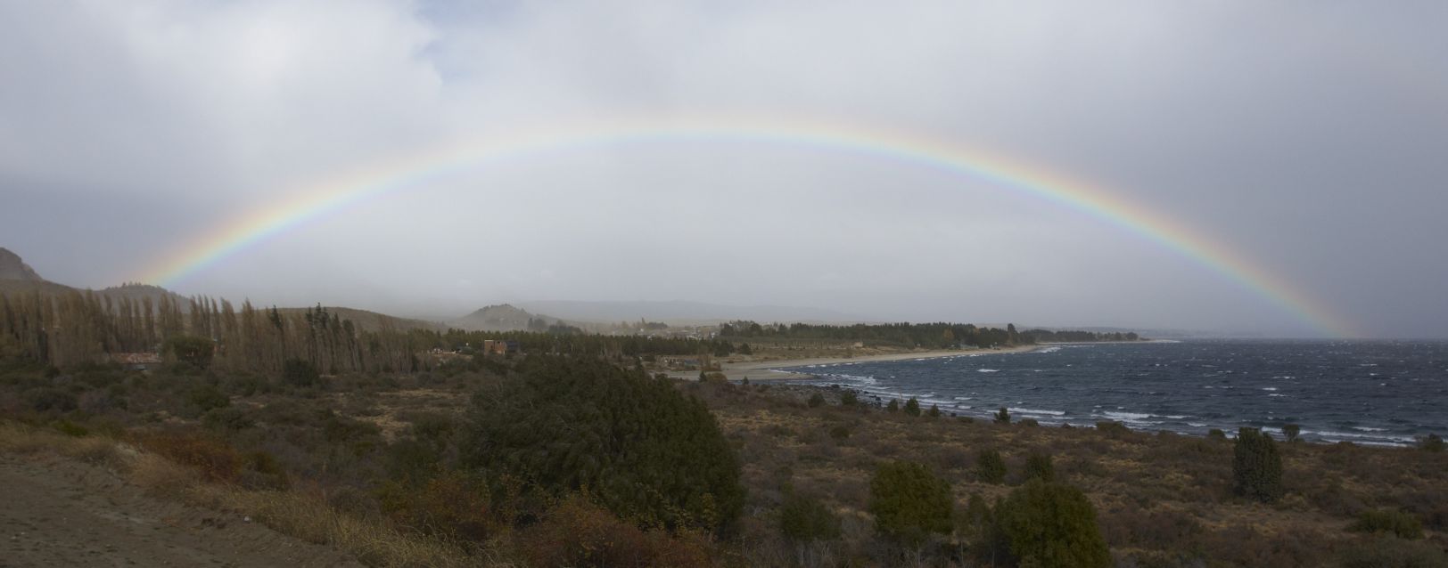 Následující den si se mnou příroda pěkně pohrála. V podstatě od rána prší. Ne moc, za to vytrvale. Z prava z hor jdou stále nové mraky s deštěm. Nademnou je pěkně hnusně. Ale asi 5 až 10 km vlevo mraky končí a začíná modrá obloha. A tak jedu v dešti a zimě (je kolem 8 stupňů) a můžu se koukat, jak malý kousek odemě je sluníčko a teplo. Navíc docela hodně fouká, naštěstí spíš ze strany, ale vítr docela hodně sráží teplotu dolů. Grrr. Kolem mě se často tvoří duha. To je hezké. Duha předemnou, duha zamnou, duha vlevo a duha vpravo. Vlastně vpravo ne, tam je pořád jen hnusně. Po dlouhé době (od Kanady) testuji své vybavení do deště. Tělo mám v suchu. Rukavice protekly za 1 hodinu, ale pořád hřejí (trochu). Boty i přes návleky protekly za 2 hodiny. Ty nehřejí ani trochu. Říkám si, že na oběd zastavím v jedné jediné dědince pro následujících 140 km, kterou mám cestou na mapě, a trochu se v hospodě ohřeji. Ale dědinu někdo ukradl. Prostě tu vůbec není. To snad ne! Navíc jsem tam měl v plánu koupit jídlo na večeři. Ach jo. Tak valím dál až končím pod mostem, kde alespoň nefouká. Měním rukavice a na nohy aplikuji igelitkovou fintu. Tj. sundat mokré ponožky, dosucha otřít nohy, dát suché ponožky, nohy do igelitové tašky a až pak do mokré boty. Tak zůstane noha v suchu a teple (alespoň nějaký čas, než igelitka proteče). Hodně to pomohlo, ale stejně jsem nějak promrzlý a i přes závětří pod mostem se klepu zimou. Vařím čínskou polívku a lámu do ní starý chleba. Nic lepšího tu nemám. Ale je to teplé, takže ok. V plánu mám dojet zhruba 40 km před Esquel, což je poslední větší městečko před hranicí s Chile, a přespat ve stanu. Ale nedostatek jídla, hnusné počasí (v dešti se mi stavět stan nechce) a taky v podstatě žádné rozumné místo (všechno v otevřené krajině ve vichru), mění mé plány. Trochu jsem se zmáčknul a dorazil to až do Esquelu. 144 km v dešti. Hmmm. Jen jsem tu měl trochu problém najít volnou postel, protože se tu zrovna koná nějaký národní turnaj v hokeji a všechny hostely jsou plné. Ale nakonec jsem uspěl přes informační kancelář, kde jedna hodná paní postupně obvolávala všechny hostely, až mi místo našla. Spím v noclehárně s čtyřmi dalšími chlapy. No bezva. Teplá sprcha, usušit oblečení, večeře a postel. To je tááák fajn.