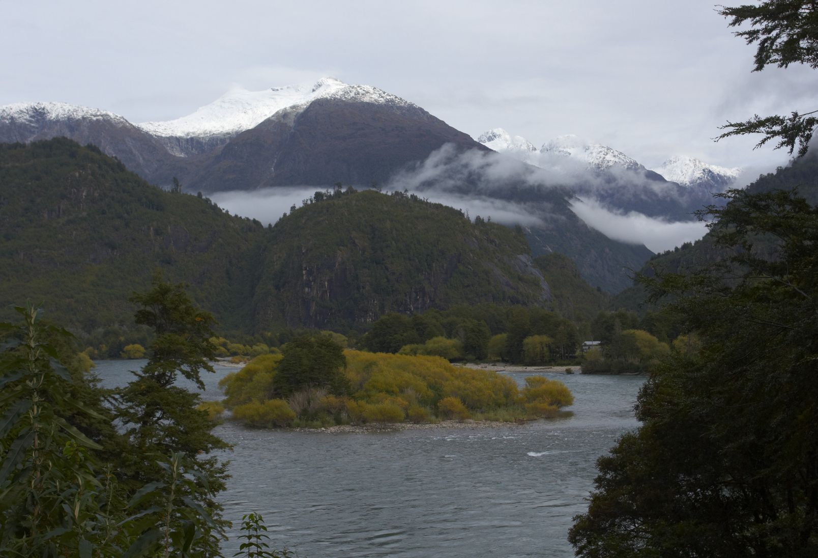 Asi 25 km za Esquelem končí asfalt a až na hranice s Chile je 40 km šotolina. Ale musím si zvykat, protože nezpevněné cesty je teď předemnou asi 300 km. Přechod hranic bez problémů. Jen zjišťuji, že už nemám skoro žádné místo na razítka v pasu. Snad to vyjde až do konce, ale bude to tak tak. Vždyť jen přechod Argentina/Chile a naopak procházím celkem 6x, tj. 12 razítek. Hranice je kousek od chilské dědinky Futaleufu v krásném hlubokém údolí s průzračně čistou velkou a prudkou řekou. Tady pro dnešek končím. Okolo jsou vysoké kopce, nahoře pocukrované sněhem. Nádhera.