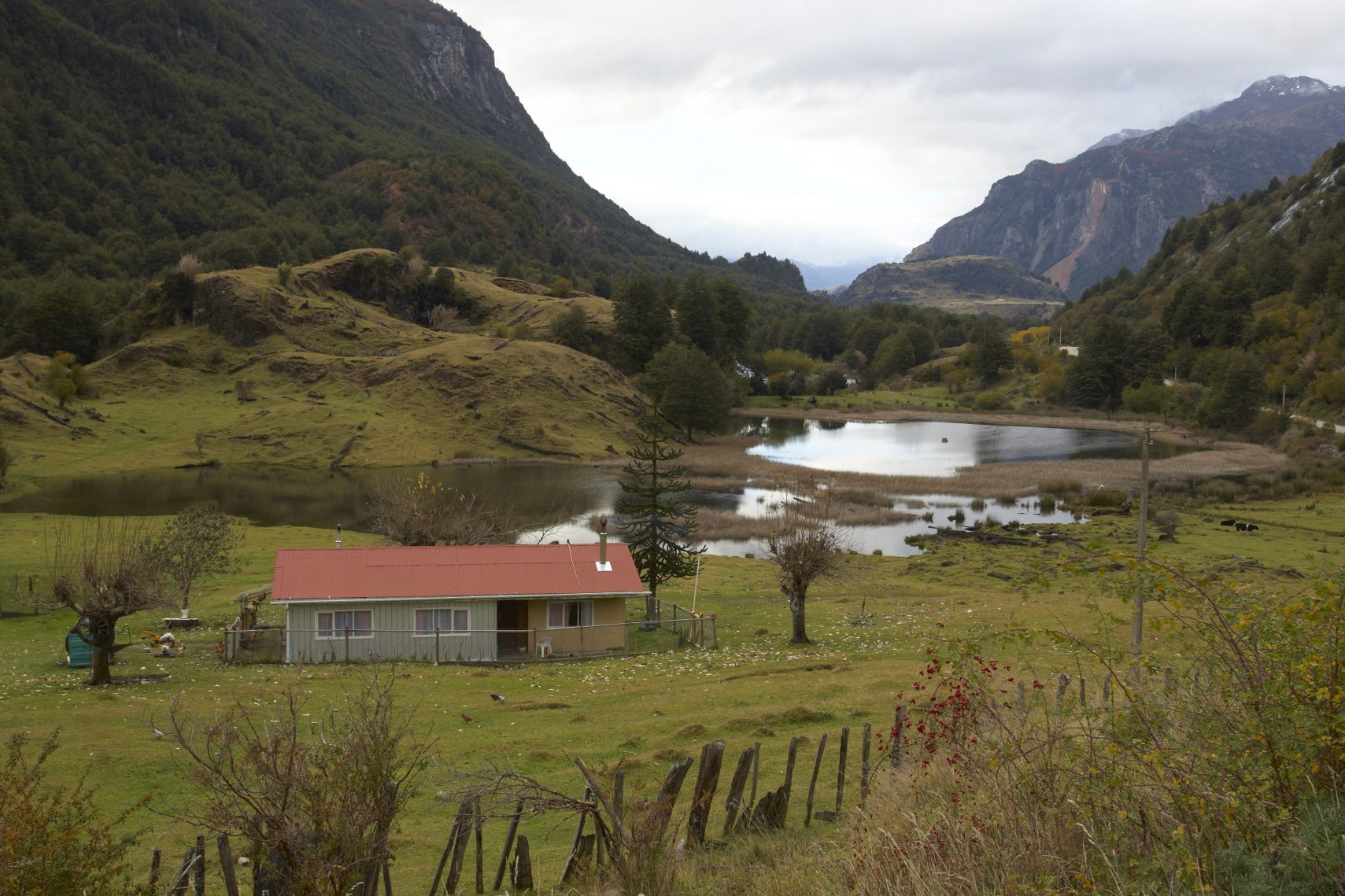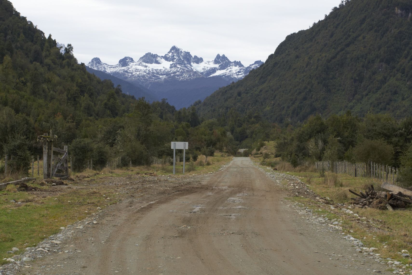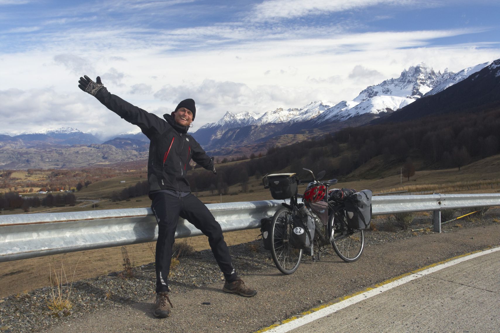 Hned v krámu ho nasazuji a s mnohem lepším pocitem jedu zpět do centra na oběd. Tam jsem po dlouhé době zase potkal krajany. Kluk s holkou s bágly na zádech jen vběhli do restaurace, pozdravili mě, protože viděli kolo s CZ, a pak zase utekli pryč. Fakt platí, že v čím větší díře člověk je, tím spíš tam potká Čecha. Po obědě jedu ještě nakoupit nějaké jídlo na další cestu. Kupuji hodně čokolády a sušenek na snídaně, protože je to tu levnější než v Argentině, kde už snad zítra budu (nakonec jsem tam dojel až za dva dny). S narvaným kolem vyrážím dál. Zase do kopce. Ach jo. Ale je hezky, chvílemi modrá obloha a neprší. Krajina se hodně změnila. Kolem mě jsou po kopcích velké pastviny a až za nimi jsou v dálce zasněžené hory. I to se mi moc líbí. Večer mám už klasicky problém najít místo na stan. Zase je všude plot. Ale kus bokem z hlavní cesty po jedné prašné odbočce jsem našel pěkné místo na trávě pod stromy. Docela fouká a je zima. Kolem 4 stupňů. Taky jsem v 800 mnm.