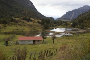 V sedle je i za deště úžasný výhled na protější skalní stěnu, která sem tam vykoukne z mraků. Nahoře ledovec, dolů padá nespočet velkých vodopádů. To se musí nechat, tady je krásně, ikdyž je pěkně hnusně. Dolů je suprový sjezd a konečně se napojuji zase na asfalt. V autobusové zastávce si konečně dávám něco k jídlu. Sotva pak vyjedu, asi po třech km, zase rupnul zadní plášť. Nebo spíš rupnul při sjezdu a teď jsem si toho všiml. Naštěstí dřív než bouchla duše, takže tentokrát bez prááásk. Zase v dešti zašívám. Ale alespoň nelepím.. Do dědinky, kam jsem chtěl na pohodu“ dojet kolem čtvrté až páté dojíždím až v sedm, za tmy. Bydlím v malém rodinném hotýlku – residenciales. Je to spíš než hotel jen rodinný domek, kde bydlí rodina, která má dva pokoje, které pronajímá. Paní mi také uvařila večeři, takže jsem maximálně spokojený. Ale nejvyššího stavu blaženosti dosahuji ve sprše. Teplá voda, uáááááááá. Pak chvíli sedím s rodinkou v obýváku a koukáme na televizi. Mají satelit se spoustou dobrých programů jako Discovery, Nat. Geographic, History, případně filmových kanálů (často v angličtině se španělskými titulky, což je super), ale koukáme na chilskou verzi X faktoru. Ach jo. Je zajímavé, že ikdyž tu (myšleno v Patagonii) bývá docela zima, tak ty jejich baráky jsou v podstatě jen minimálně zateplené. Okna jsou jednoduchá, často to jsou šoupačky. Na topení pouze krb na dřevo. Večer v něm zatopili, dali tam dvě polena a to bylo vše. V obyváku bylo 17 stupňů, v mé ložnici 14, ráno 12. Venku 5. Ale oni si radši vezmou huňatý svetr. A ten já nemám a mikinu suším u krbu.