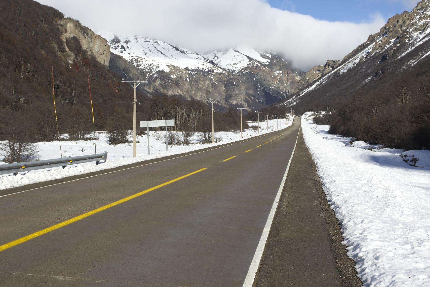 Ráno je slušná kosa. Něco kolem nuly. Fakt se mi ze spacáku nechce. Ale venku je hezky, nebe bez mráčku. Takže nakonec vylézám. Jedu do Puerto Ibáněz a odtud trajektem přes jezero General Carrera (v Argentině mu říkají Buenos Aires) do Chile Chico. To už je hraniční město s Argentinou. Cesta vede do sedla v 1100 mnm. Kolem už je sníh a na silnici je místy náledí. Ale postupně se otepluje a z původních 3 stupňů teplota vylezla na slušných 8. A to už je silnice suchá. Kolem oběda jsem se rozloučil s carreterou Austral a odbočil na cestu do Puerto Ibáněz. Bylo mi to skoro líto. Carretera vedla k nádherným zasněženým horám a úplně to lákalo se po ní vydat dál. Ale tam už z ní není možnost uhnout a na konci už dávno nejezdí trajekty (je po sezóně), takže teď je to dlouhá slepá ulička. Kousíček za křižovatkou jsem zahlédl cedulku s nabídkou ubytování s jídlem a šipkou k jedné malé farmě. Neváhám a jedu se ohřát. Je to docela sranda. Člověk dojede k baráku, zazvoní a zeptá se, jestli mají oběd. A taková milá paní mě hned zve dovnitř. Zrovna si dělala oběd pro sebe, tak jen přidala jednu porci masa na pekáč a je to. Bydlí tu sama a protože není sezóna, tak tu nemá ani žádné hosty. A tak jíme spolu v kuchyni. Příjemně se s ní povídá. Je to jako někde na návštěvě. Jen na konci musím zaplatit. Docela mě překvapilo, že tu prý v zimě není moc sněhu. Tak kolem půl metru. A loni dokonce nebyl sníh vůbec. A přitom okolo jsou už teď zasněžené hory.. Odpoledne dojíždím do přístavu, Kupuji lístek na trajekt a čekám do večera, kdy trajekt odplouvá. Při nalodění jsem potkal po dlouhé době zase cykloturisty, kteří z lodi vystupovali. Jedou na sever za teplem, jak jinak. Jsou z Francie a na dvojkole vyrazili z Ushuaia do Francouzské Guyany. Moc mě nepotěšili. V pampě na jihu už prý sněží. Ajajaj.