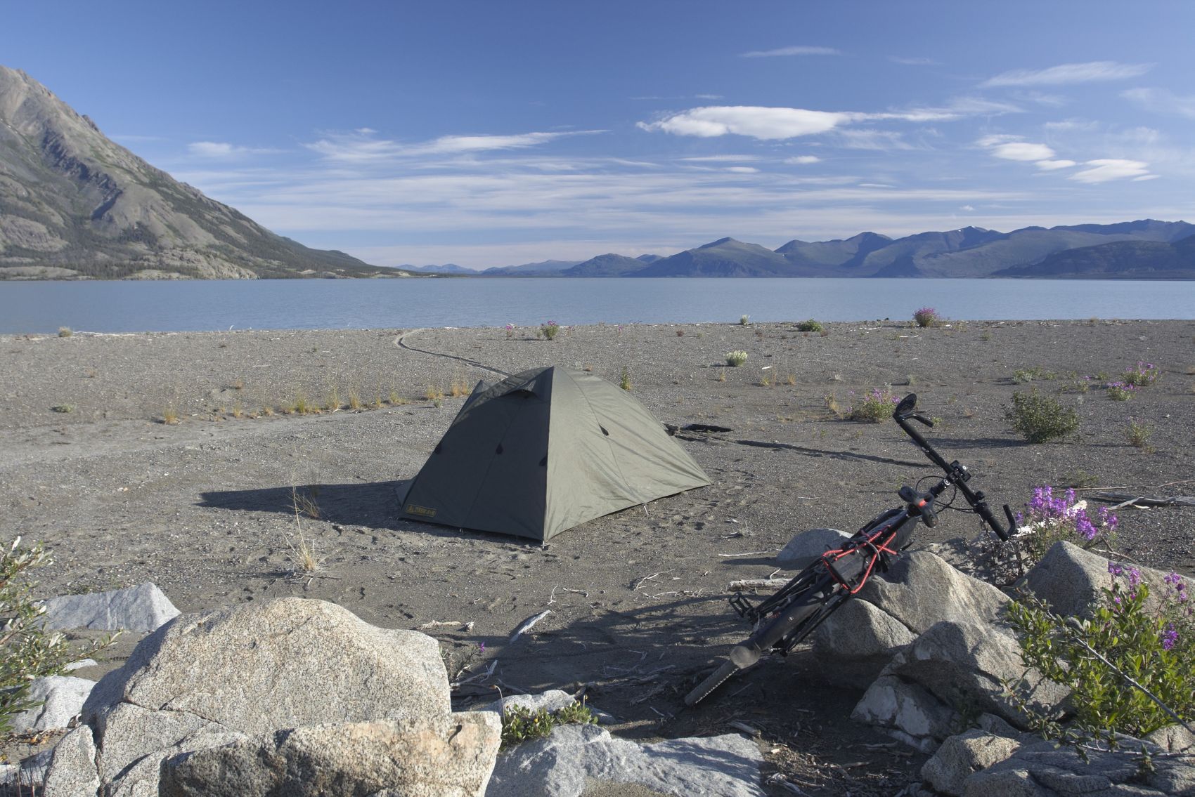 Jenže pak člověk chvíli pozoruje v příkopě medvěda, kouká na úžasné hory v dálce (Mt. Logan) a dojede k nádhernému jezeru, u kterého postaví stan. A potom leží ve spacáku a kouká na hory nad jezerem a je mu báječně. No není to cestování po Kanadě nádhera?