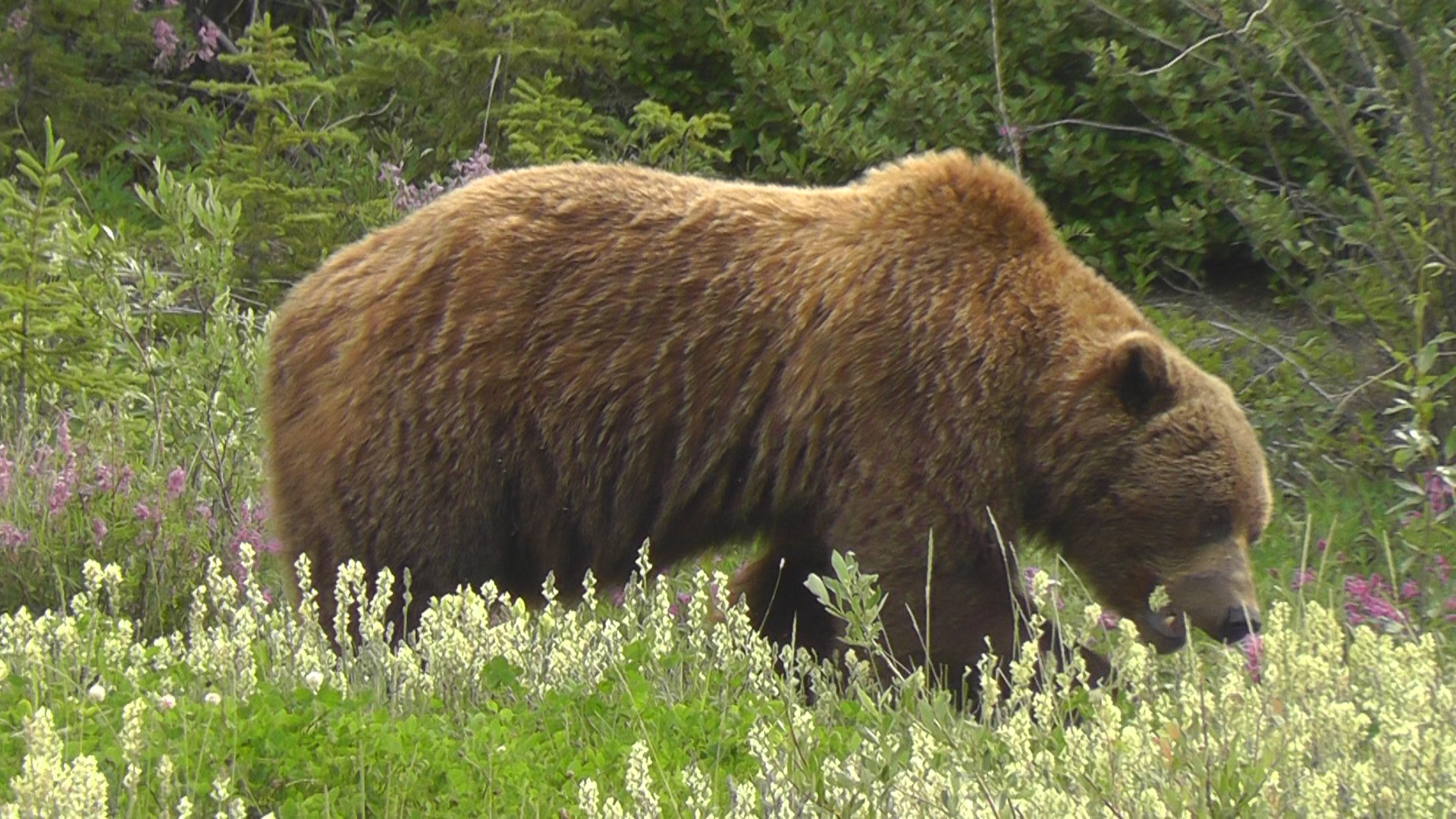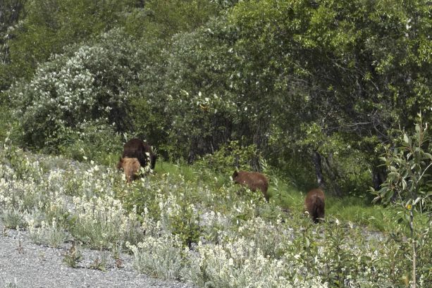 S medvědy se pak v Kanadě docela roztrhl pytel. Zatímco na Aljašce jsme ze sedla kola žádného neviděli (jen v NP Denali), tak tady každý den vidím jednoho, dva. Už se moc nestresuju, většinou zastavím, koukám, co bude dělat, a když je klidnej, tak vytáhnu kameru a točím. Pro ostatní auta jsem jako signál, že je tu něco zajímavého. Tak už z dalky zpomalují až v klidu přijedou až ke mě. Jednou se u mě takto postupně nashromáždilo asi pět aut.