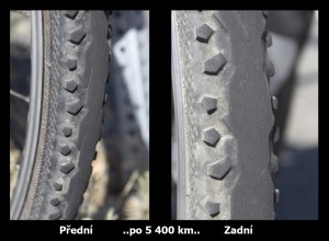 Zadní pneu sjeté už docela hodně, přední jen lehounce. Jejich výdrž mě dost překvapila. Přehodil jsem přední na zadní v cca 5400 km. Myslím, že dalších 5 tisíc ještě dají. Při přehazování jsem taky koukal, co je v nich (hlavně v zadním) nasekaných dírek a zářezů. Posledních cca 1000 km mám hodně defektů. Předtím 4000 km nic a teď téměř obden. Až na jeden případ je to pokaždý malý drátek cca 4mm (taková špona). Mám podezření, že jsem někde projel nějakou jejich hromadou a oni se mi teď postupně prokousávaj pláštěm. Moc se mi totiž nezdá, že bych měl takovou smůlu a každý dva dny najel na podobnej pitomej drátek. Budu muset pláště pořádně proklepnout, jestli tam ještě nějakej není (samozřejmě při píchnutí ho vždy prohlídnu a drát vytáhnu).- Brzdové špalíky zbroušené asi do poloviny (stále první originály Shimano XT)