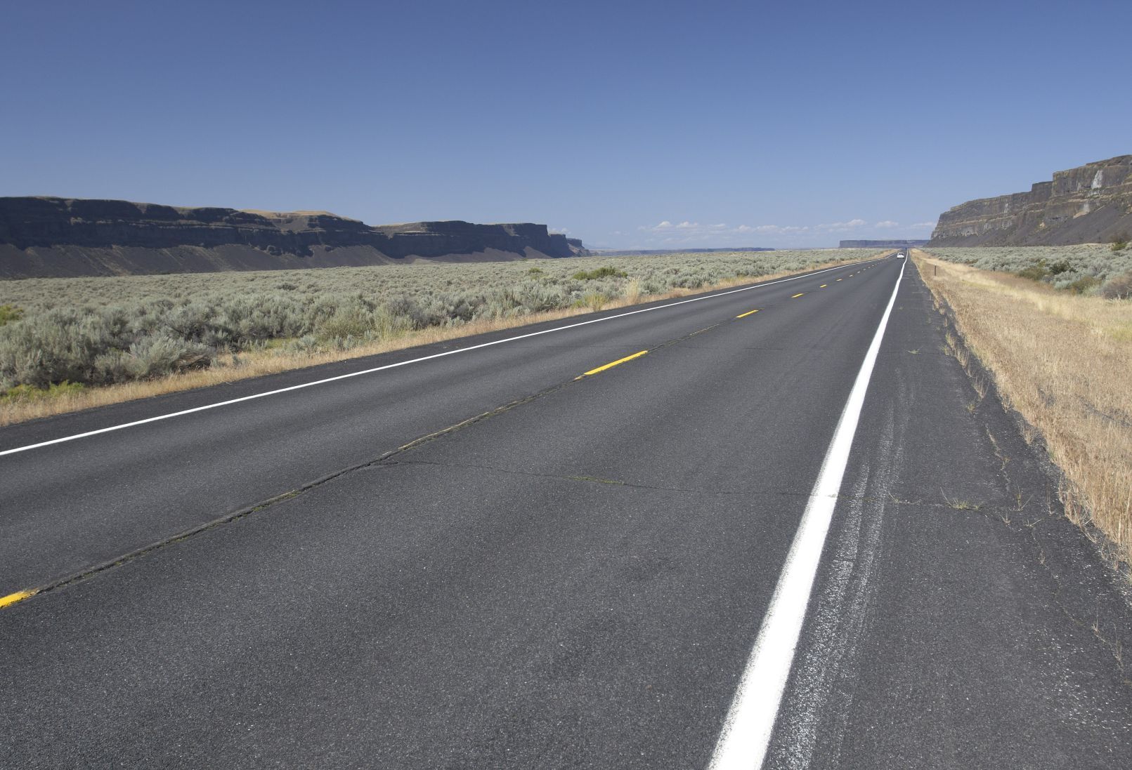 Na konci dne odbočuji z doporučované cesty a jedu vedlejší cestou přímo na jih. Hned od začátku jsem nadšený. Dojíždím k k Suchým vodopádům (Dry Falls). Je to v podstatě takový Grand Canyon v „malém“. Uvozovky jsou na místě, protože i tak je to šíleně obrovský. Cesta vede postupně do údolí, které vzniklo tak, že za poslední doby ledové tady byl obrovský vodopád a ten si postupně pod sebou ukrajoval a podemílal skálu. Až se posunul o hromadu kilometrů. A tím vzniklo toto široké koryto, po jehož stranách jsou vysoké skalní stěny. Dnes už tu ale žádná voda neteče, tak proto ten název Suchý vodopád. V údolí už zůstalo jen několik velkých jezer. U jednoho z nich spím. Koupu se už za tmy. Plavu si v teploučké vodě, svítí měsíc a z druhé strany jezera od nějakých domů hraje country. No romantika, co vám budu povídat.